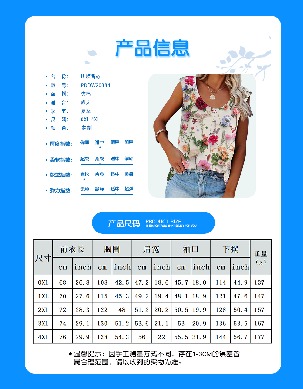 中文名称:女U领背心大码女装英文名称:产品货号:PDDW20384生产工艺: 满印印花产品材质:仿棉