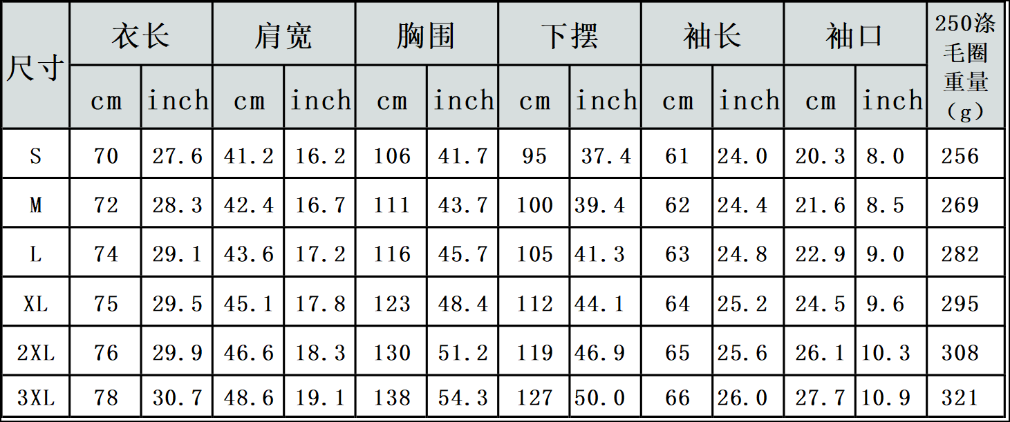 【特别说明】此尺码数据在衣服平铺下测量所得,因测量方法不同,误差在1-3cm内的属于正常现象