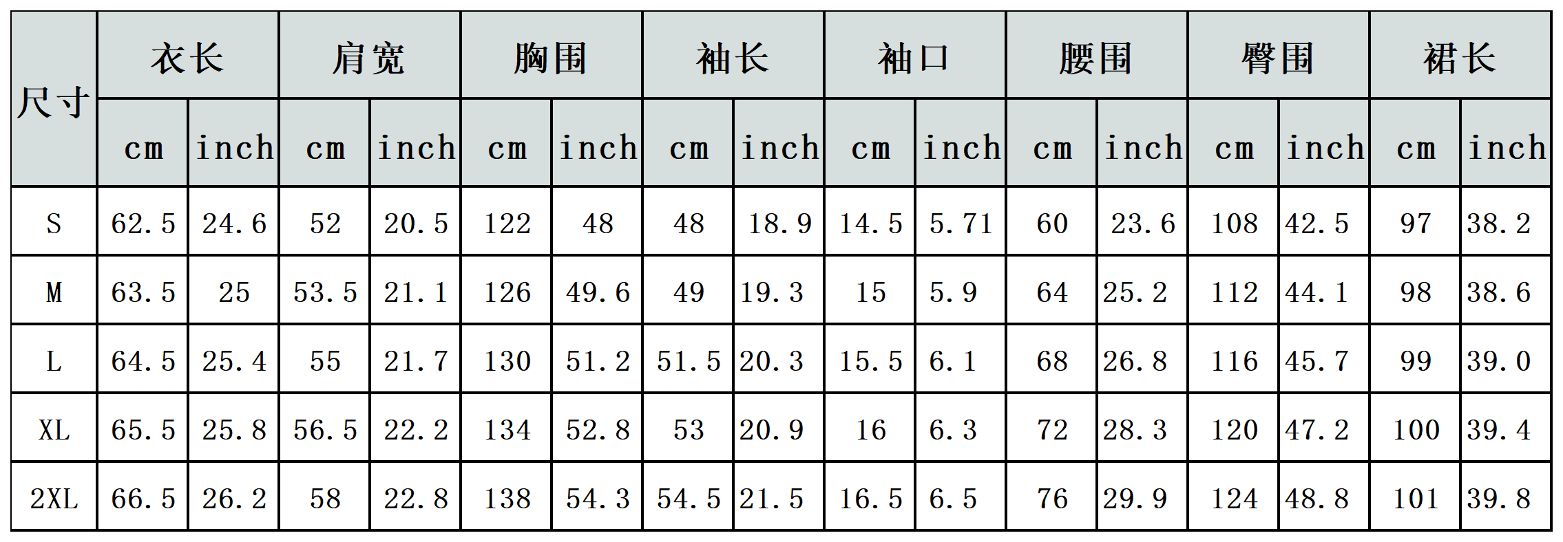 【特别说明】 此尺码数据在衣服平铺下测量所得,因测量方法不同,误差在1-3cm内的属于正常现象