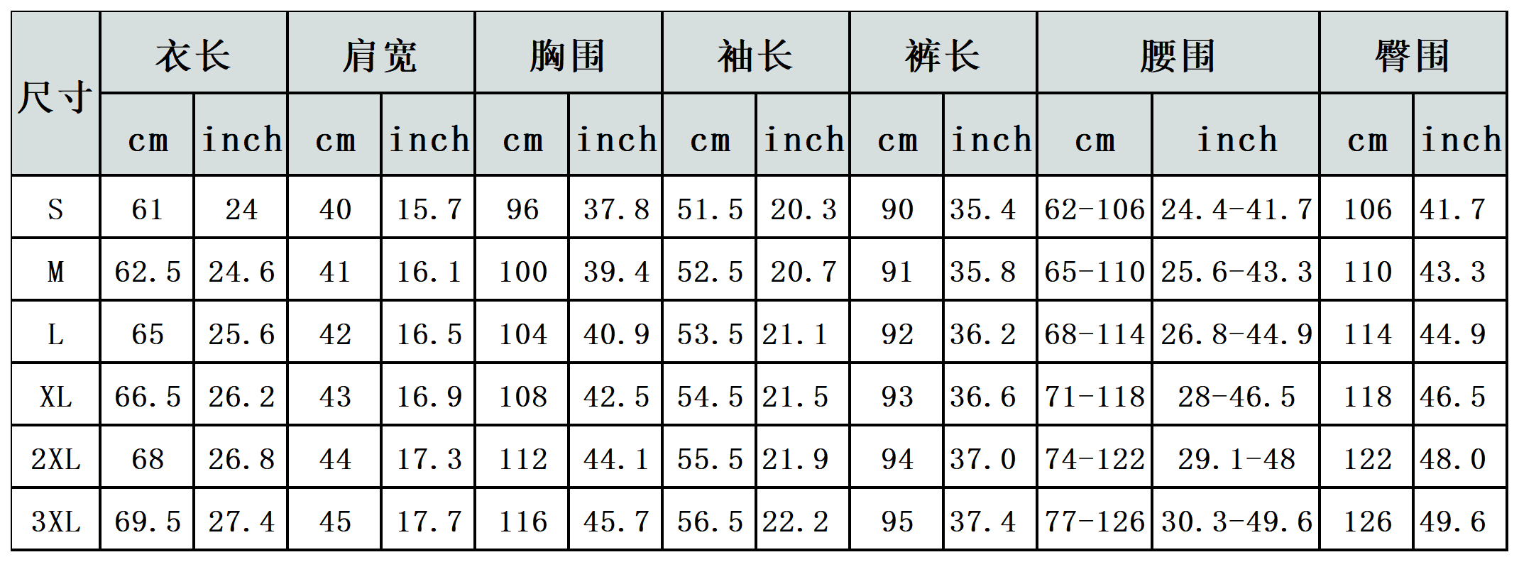 【特别说明】此尺码数据在衣服平铺下测量所得,因测量方法不同,误差在1-3cm内的属于正常现象