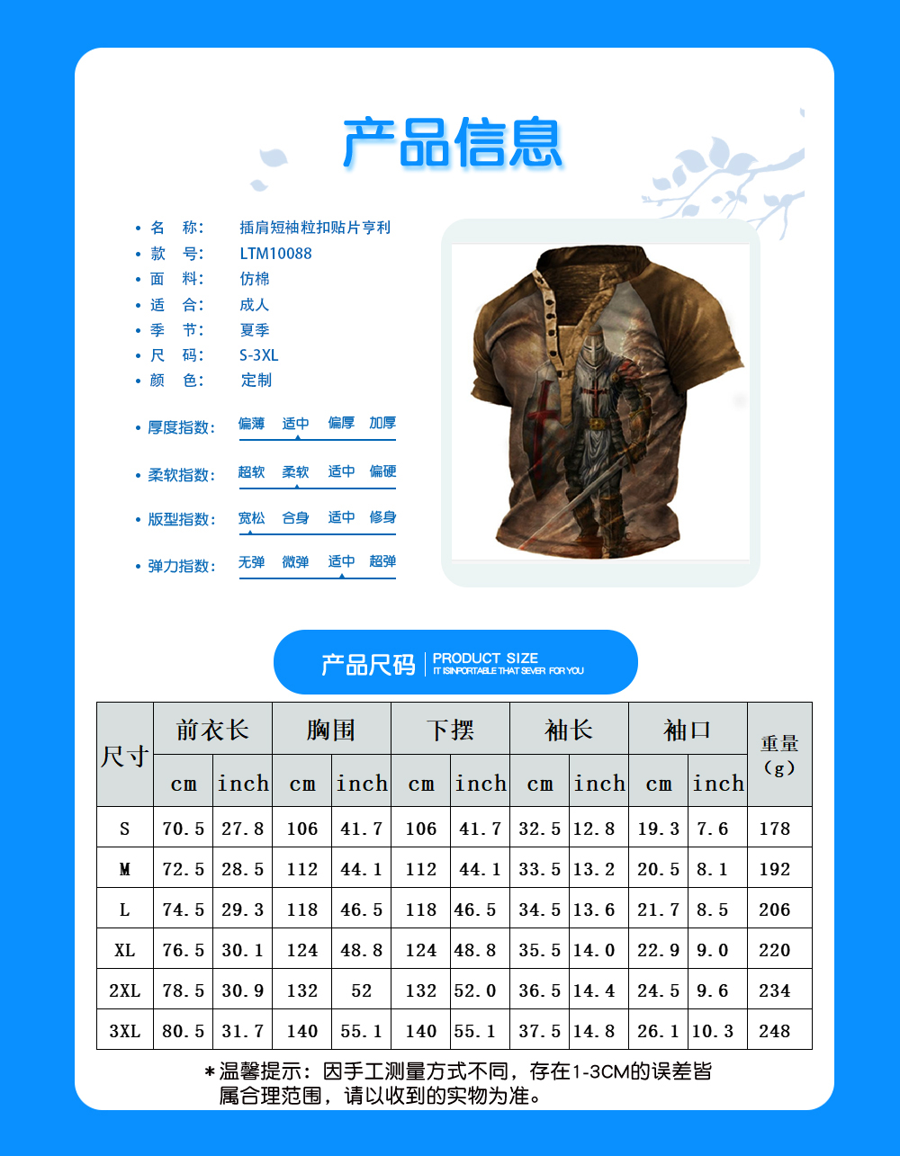 男数码印仿棉插肩短袖6粒扣贴片亨利LTM10088