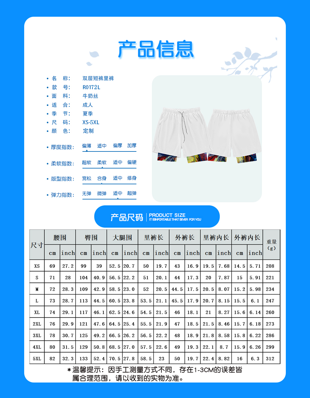 【产品性能】柔软轻巧速干,亲肤,穿着宽松,非常舒适。弹力腰围,穿脱方便,适合身材范围更广。