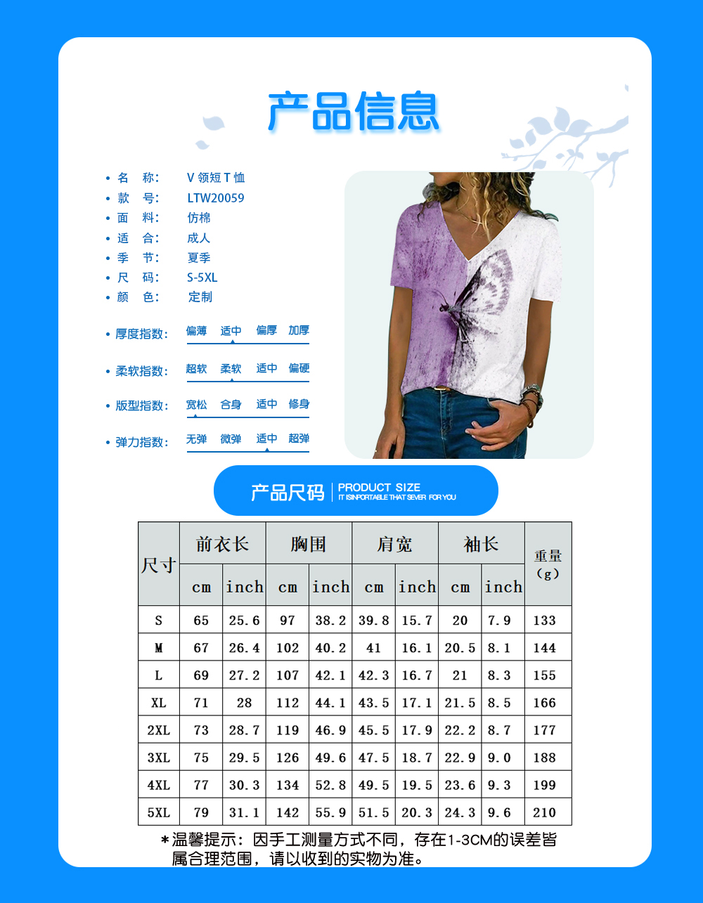 中文名称:女数码印仿棉短袖V领短T恤英文名称:产品货号:LTW20059X生产工艺: 满印印花产品材质: 仿棉