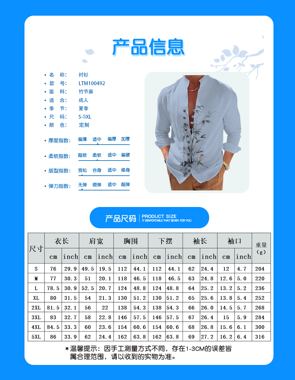 中文名称:衬衫英文名称:产品货号:LTM100492生产工艺: 满印印花产品材质: 竹节麻