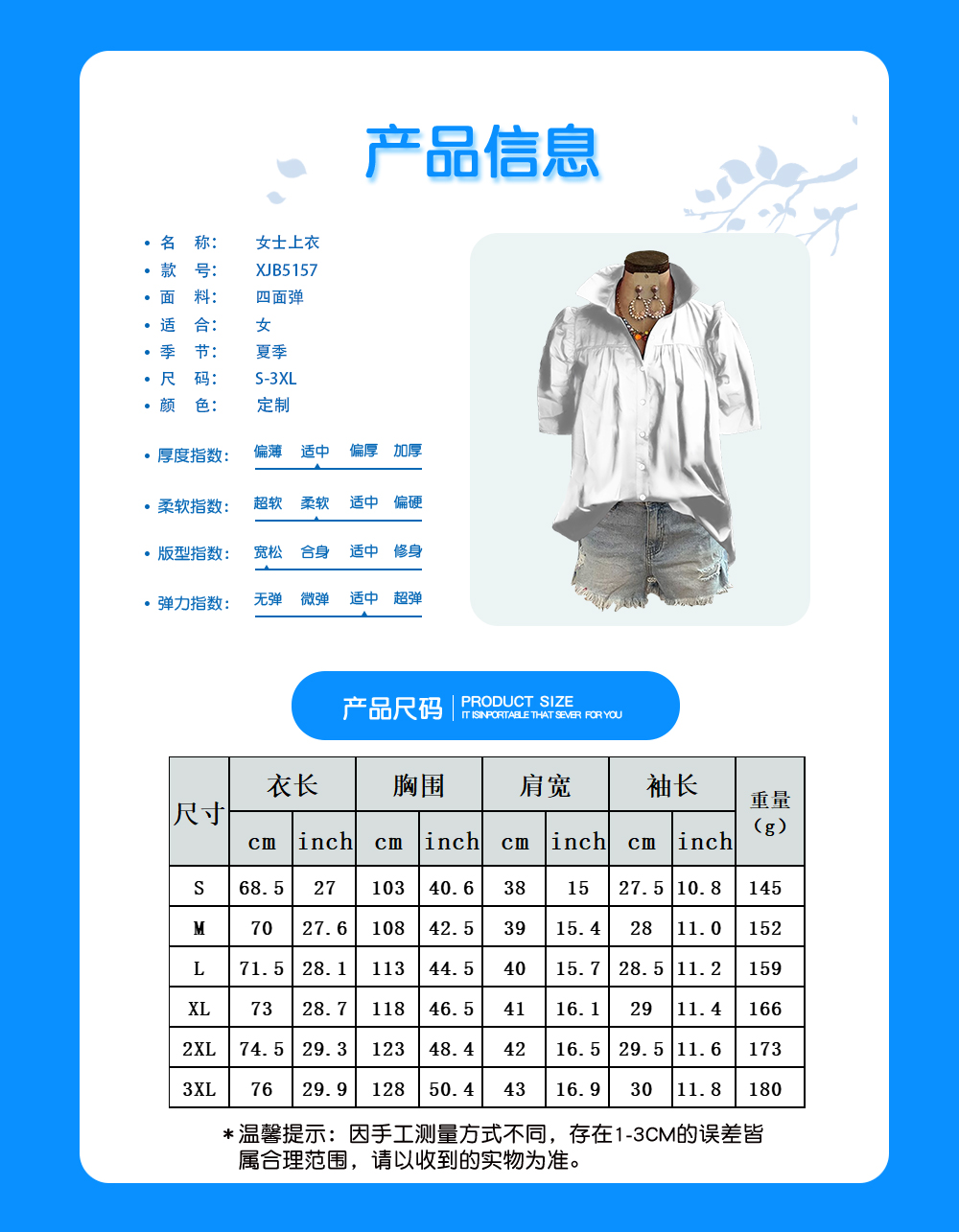 | 尺寸 | 衣长 | 胸围 | 肩宽 | 袖长 | 重量(g) | ||||
