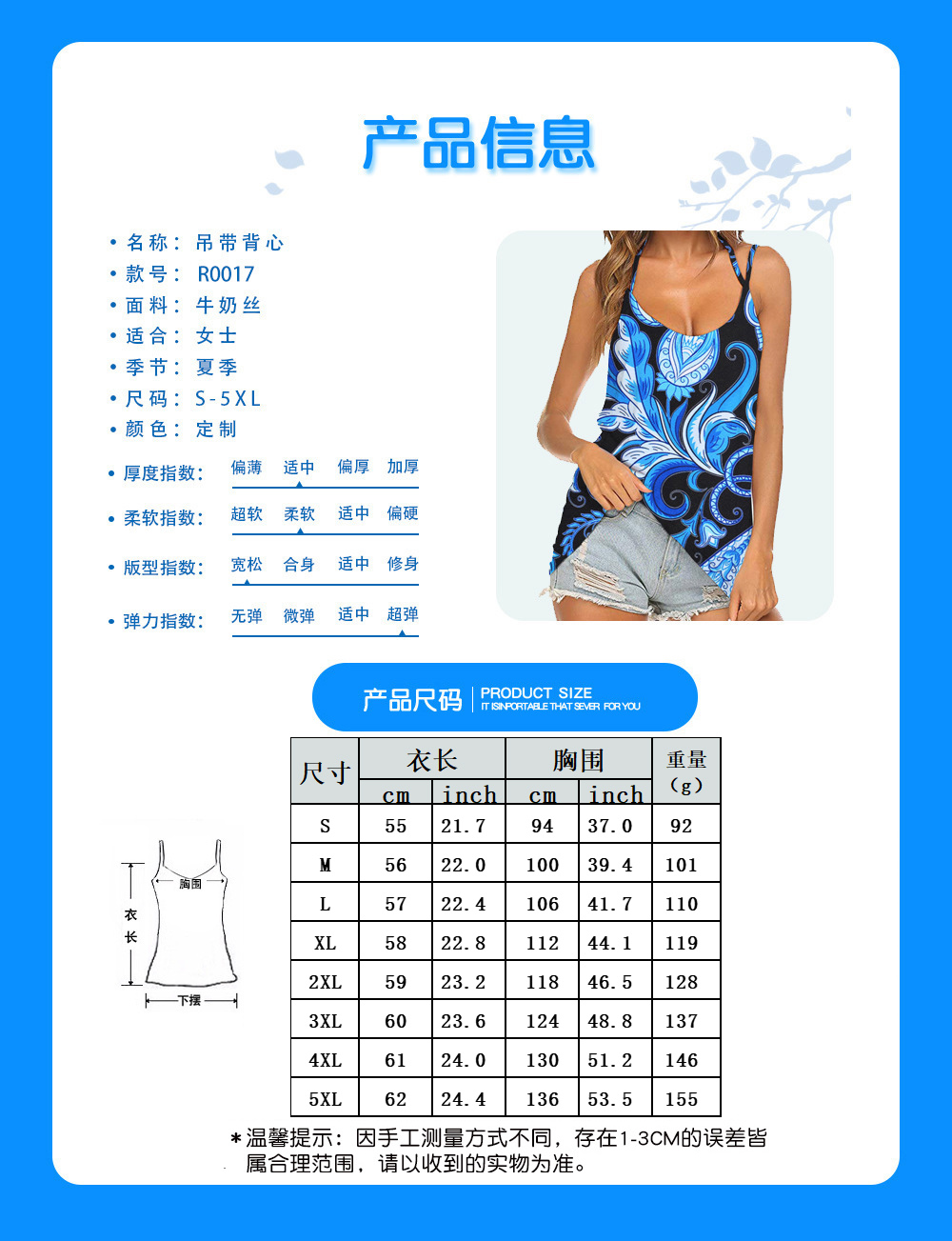【特别说明】 此尺码数据在衣服平铺下测量所得,因测量方法不同,误差在1-3cm内的属于正常现象
