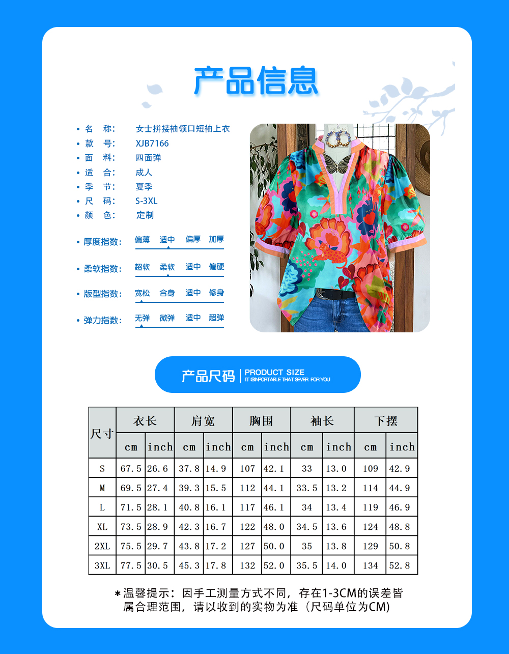 中文名称:女士拼接袖领口短袖上衣英文名称:产品货号:XJB7166生产工艺: 满印印花产品材质:四面弹