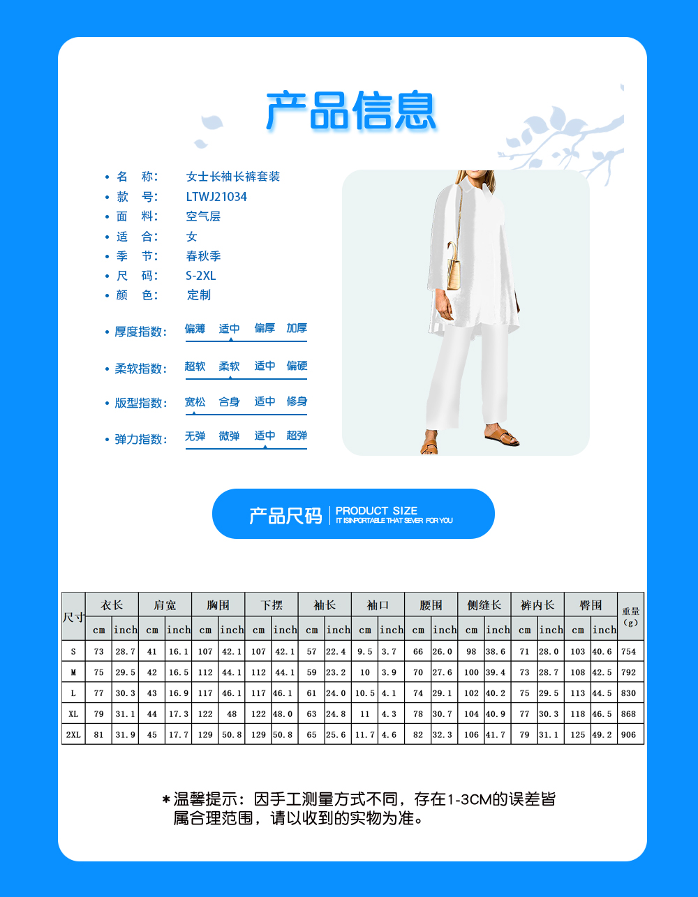 中文名称:女士长裤长袖套装 英文名称:产品货号:LTWJ21034X 生产工艺: 满印印花 产品材质:空气层