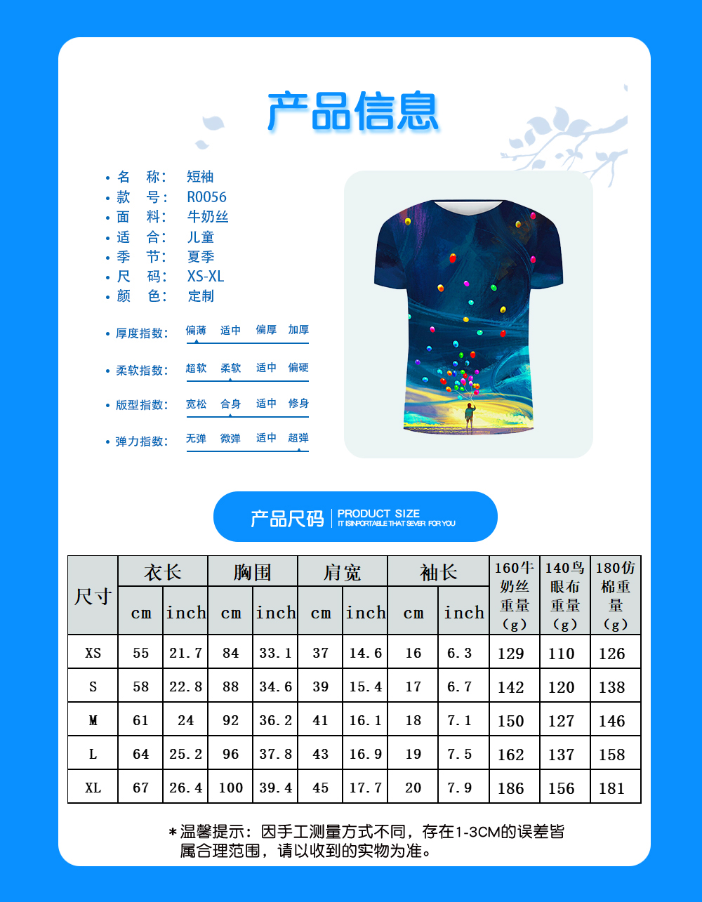 | 尺寸 | 衣长 | 胸围 | 肩宽 | 袖长 | 160牛奶丝重量 (g) |