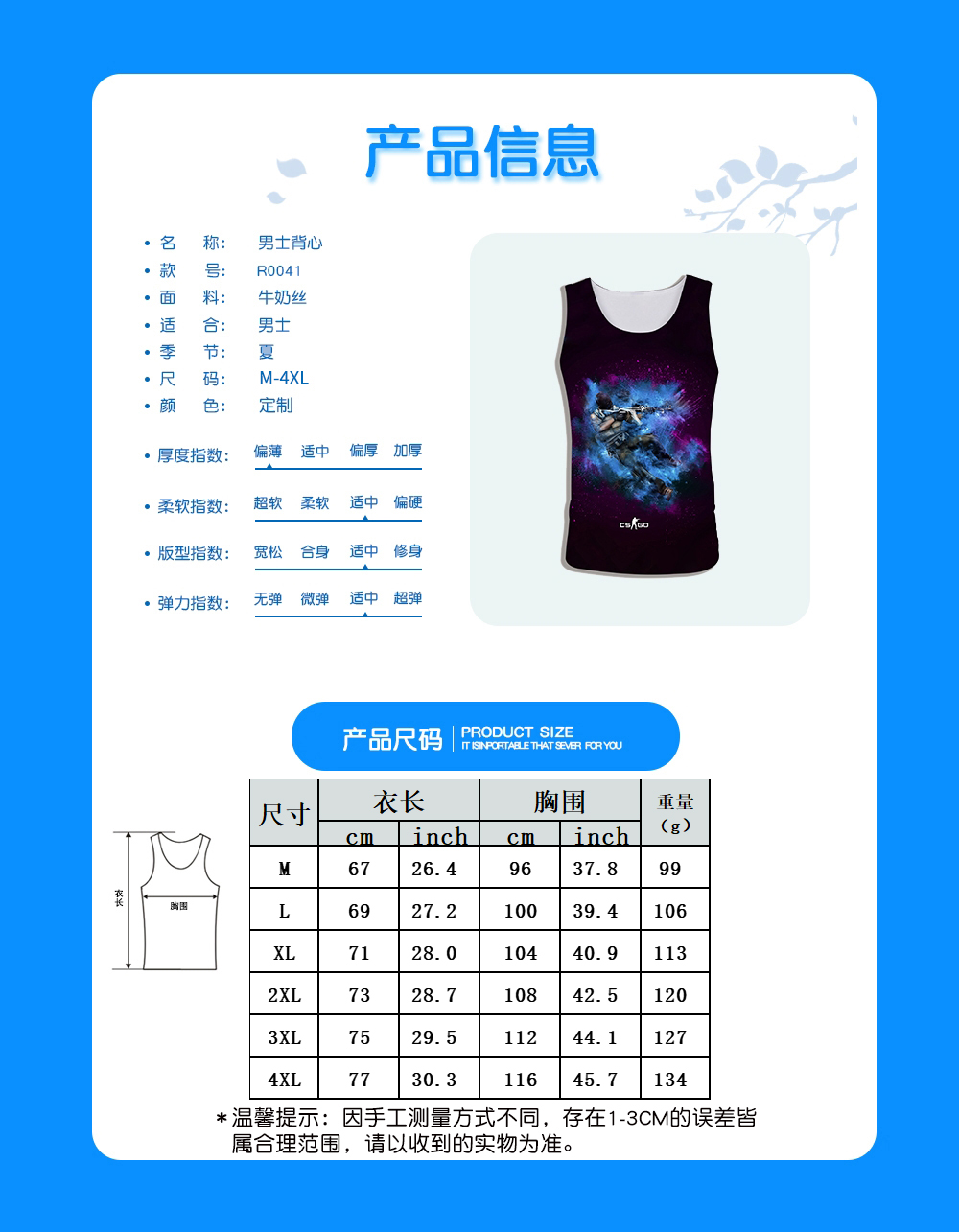 | 尺寸 | 衣长 | 胸围 | 重量 (g) |