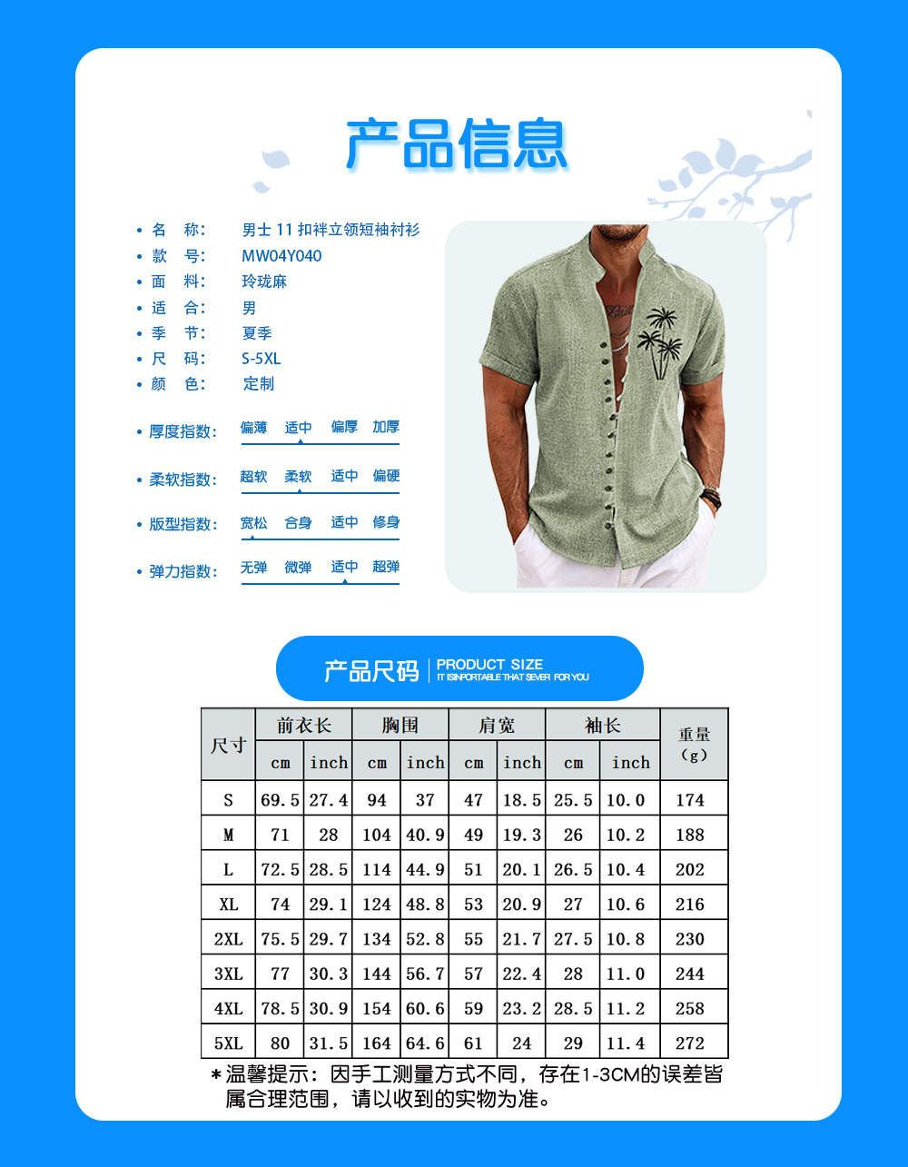 中文名称:11扣袢立领短袖衬衫英文名称:产品货号:MW04Y040X生产工艺: 满印印花产品材质: 玲珑麻
