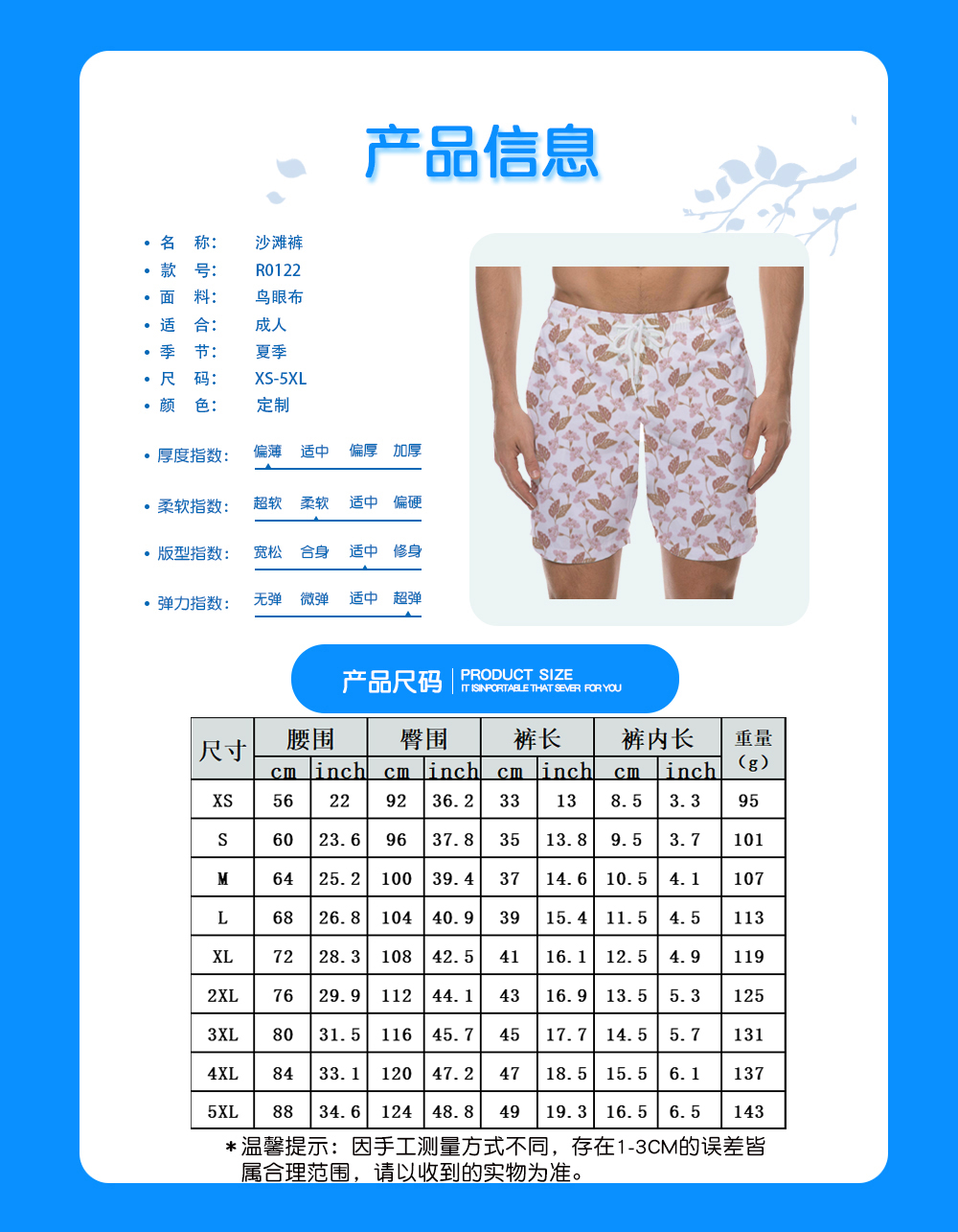 中文名称:沙滩裤英文名称: Men's beach shorts产品编号:R0122X生产工艺: 满印印花产品材质: 鸟眼布