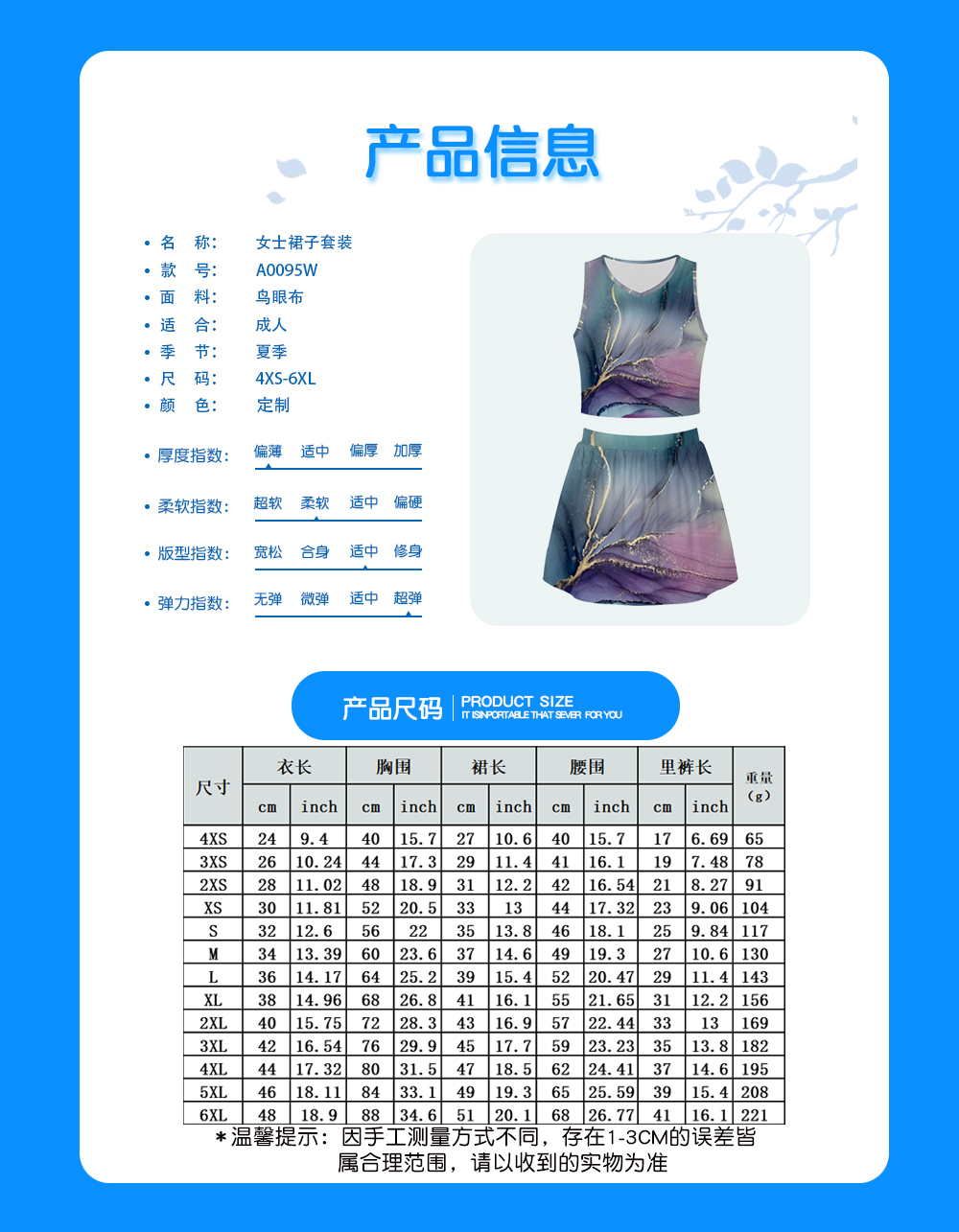 中文名称:女士裙子套装无袋无袖口无脚口装英文名称:产品编号:A0095WX产工艺: 满印印花产品材质: 鸟眼布