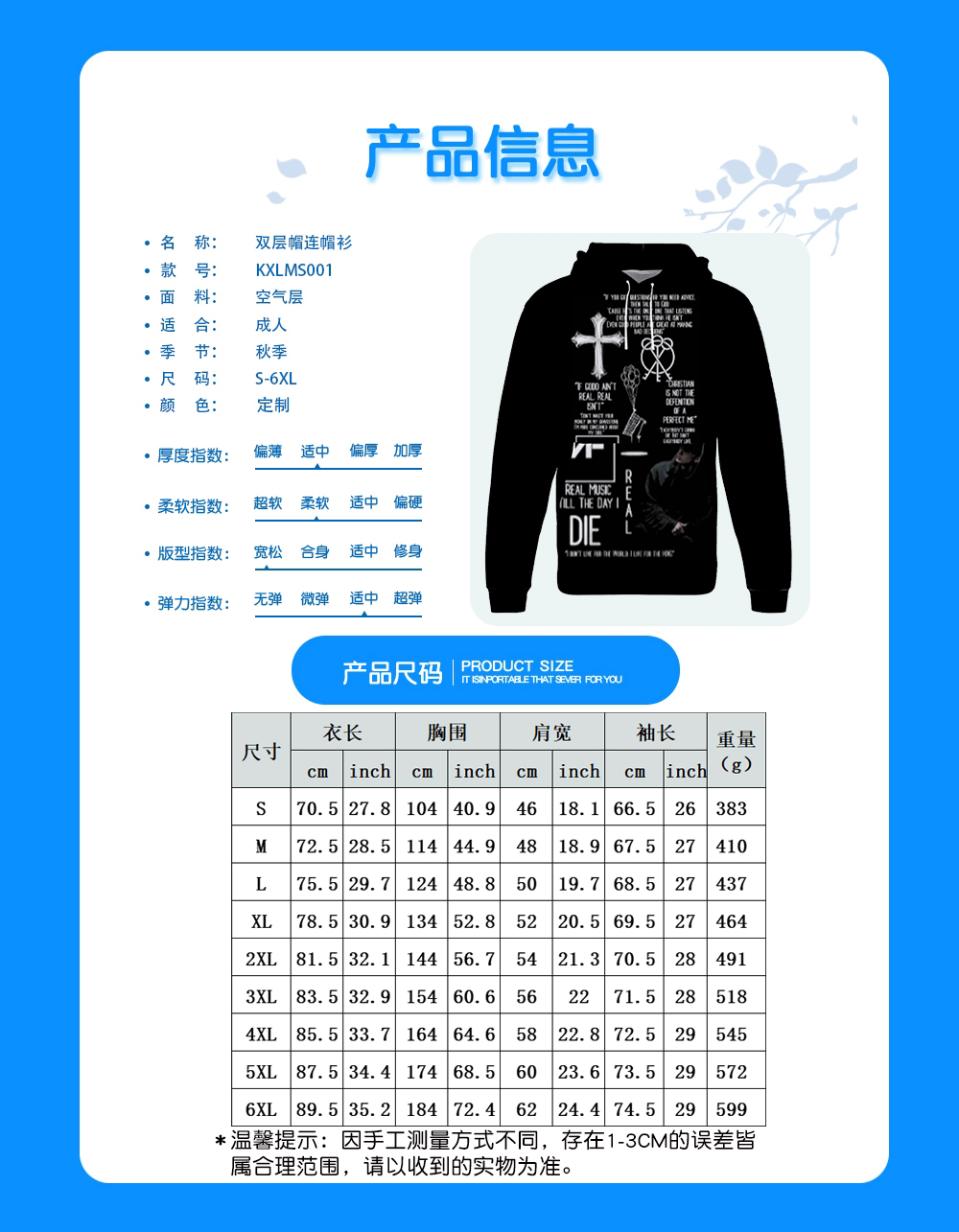 中文名称:连帽卫衣英文名称:产品货号:KXLMS001X生产工艺: 满印印花产品材质: 空气层