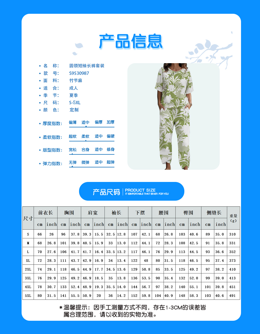 中文名称:圆领短袖长裤套装英文名称:产品货号:S9530987生产工艺: 满印印花产品材质: 竹节麻