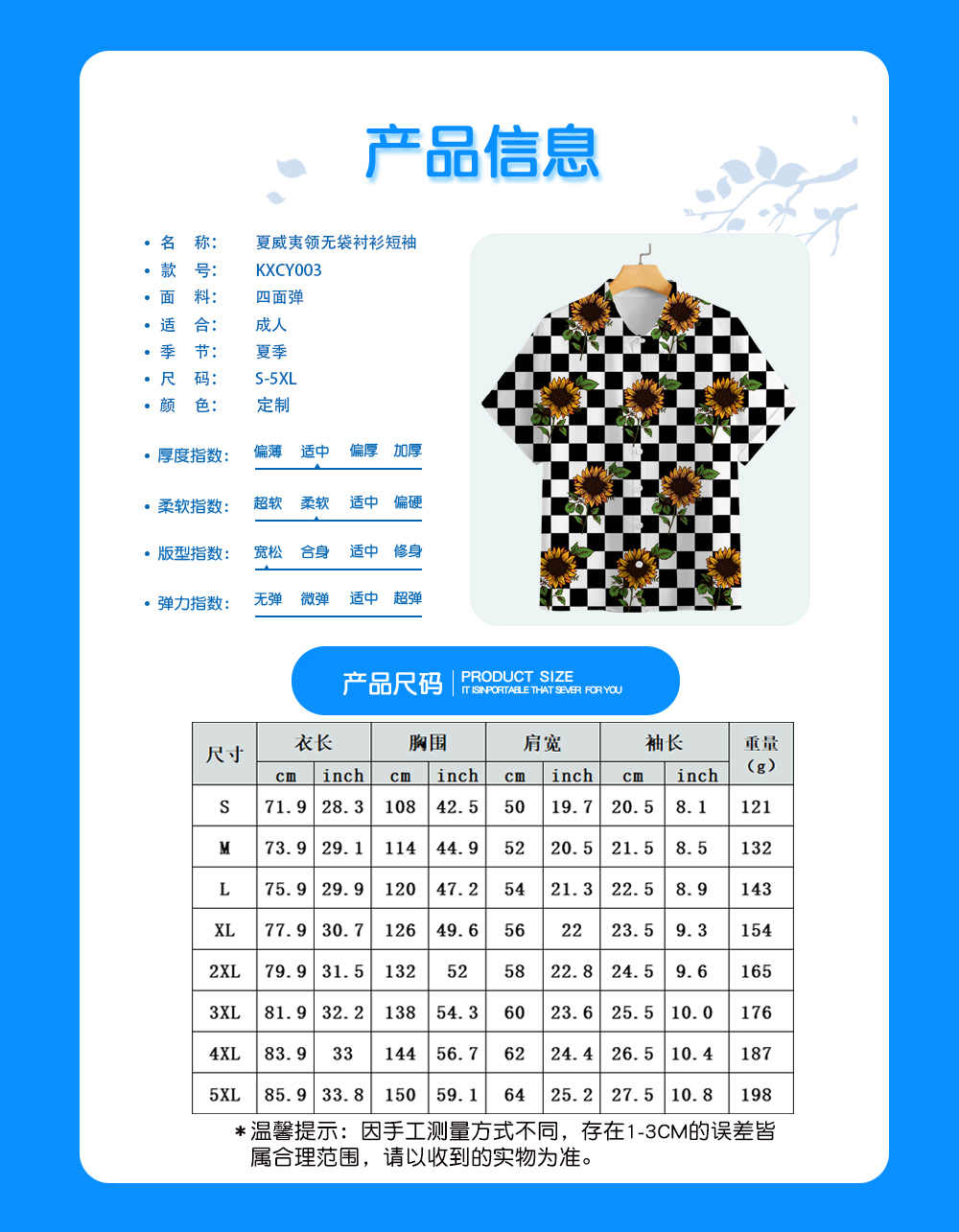 中文名称:衬衫英文名称:产品货号:KXCY003生产工艺: 满印印花产品材质:四面弹