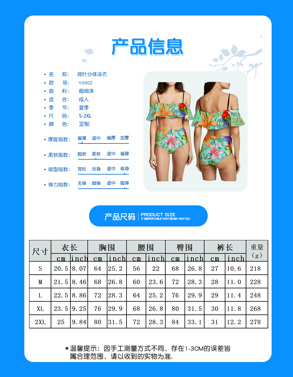 中文名称: 3D 荷叶分体泳衣英文名称: Lotus leaf split swimsuit产品编号:Y0002X生产工艺: 满印印花产品材质: 超细涤