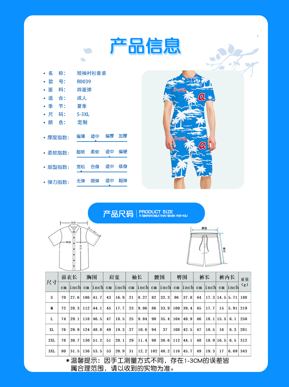 中文名称: 3D 短袖衬衫套装欧码版英文名称: Short sleeve shirt suit产品编号:R0039X生产工艺: 满印印花产品材质: 四面弹