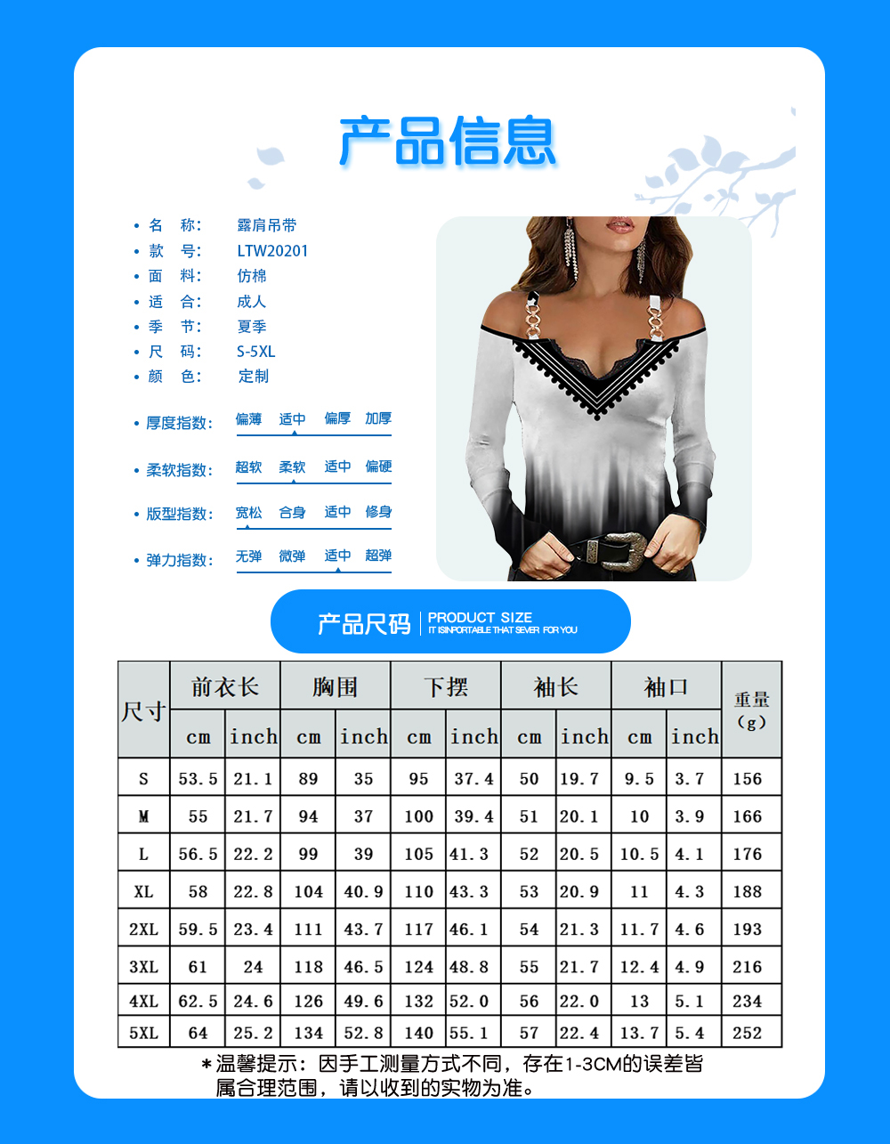 中文名称:女士露肩带肩带扣吊带V领长袖T恤英文名称:产品货号:LTW20201生产工艺: 满印印花产品材质: 仿棉