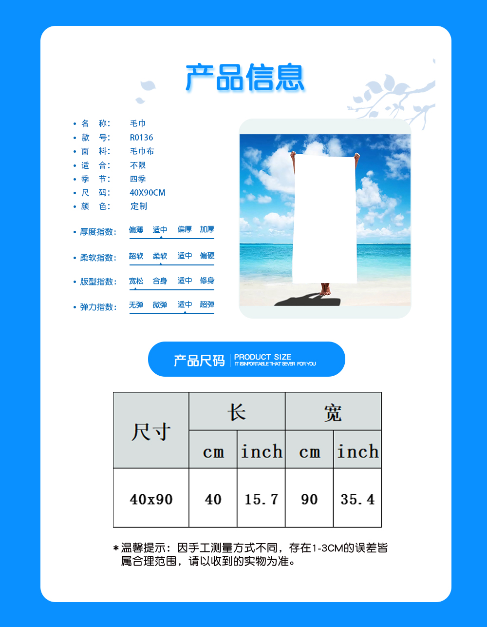 中文名称: 毛巾40x90CM英文名称:产品编号:R0136生产工艺: 满印印花产品材质:毛巾布