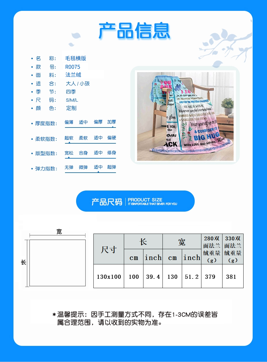中文名称: 3D 毛毯横版法兰绒130X100cm英文名称: blanket产品编号:R0075生产工艺: 满印印花产品材质:法兰绒