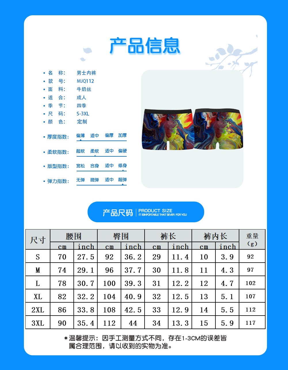 中文名称:男士内裤英文名称: Briefs产品编号:MJQ112生产工艺: 满印印花产品材质: 牛奶丝/超细涤/仿棉
