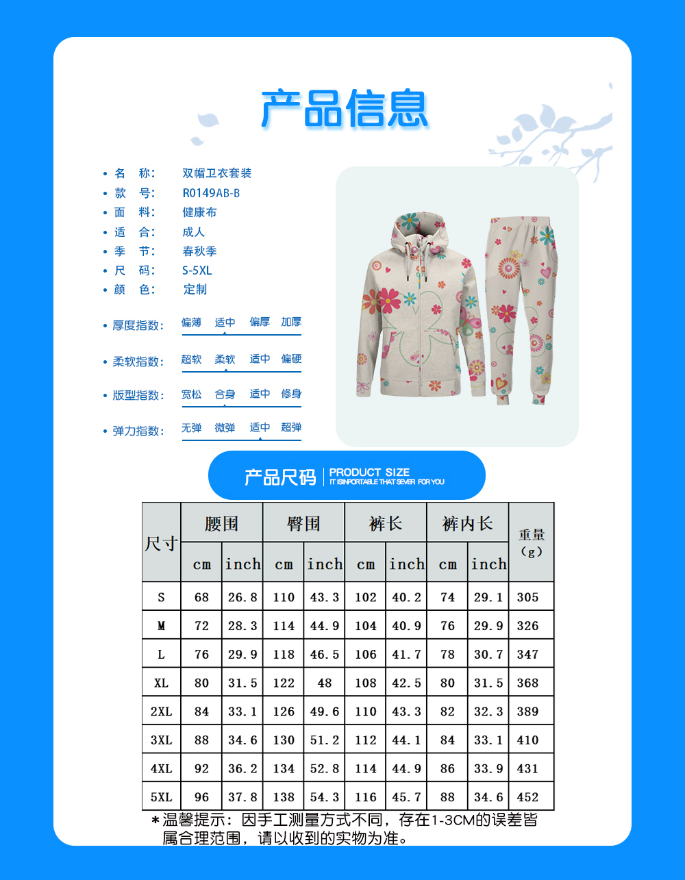 中文名称:双帽套装-裤子英文名称:产品货号:R0149AB-B生产工艺: 满印印花产品材质:健康布