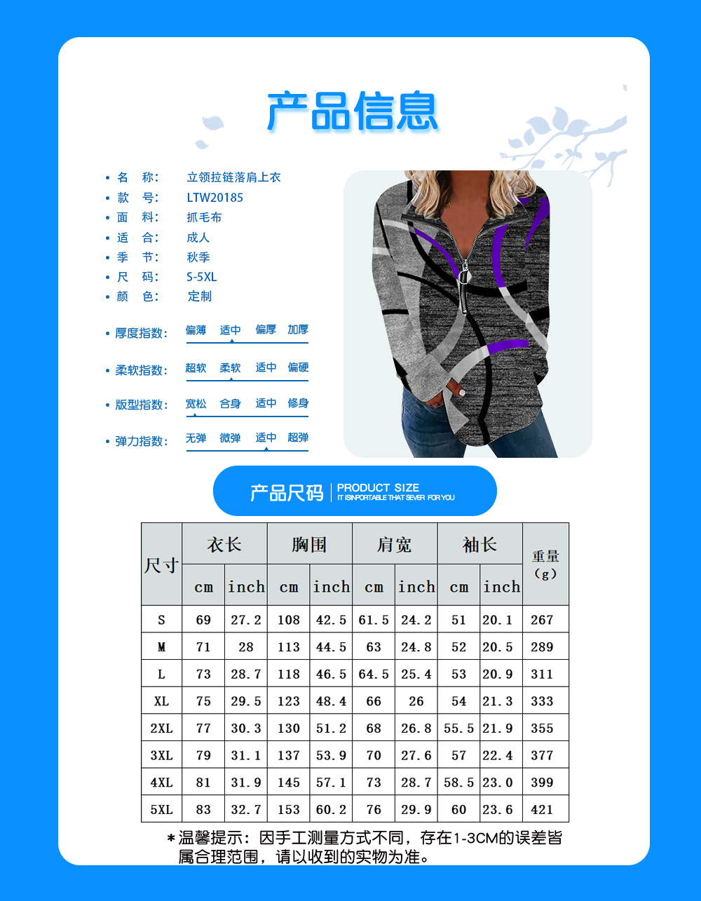 其他描述:立领半开拉链落肩长袖