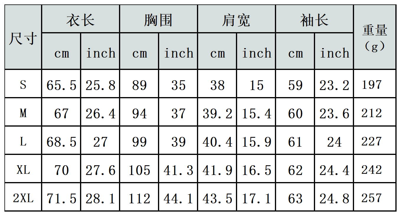 【特别说明】此尺码数据在衣服平铺下测量所得,因测量方法不同,误差在1-3cm内的属于正常现象